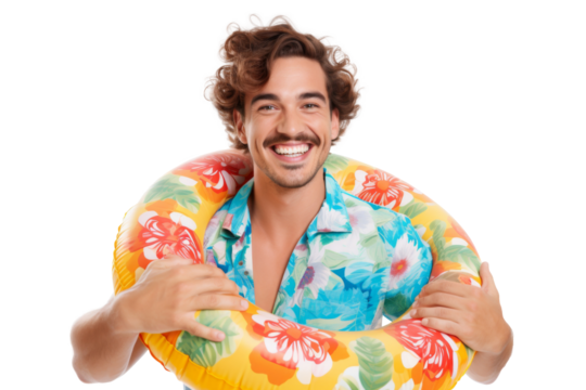 Portrait happy man with summer holiday beach outfits isolated on transparent background for realax at beach on vacation, travel and holidays vacation concept.