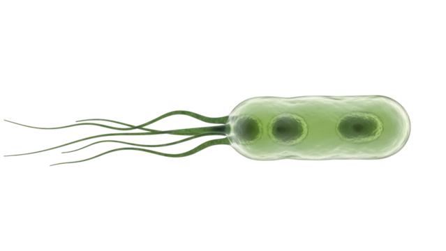 Green bacterium with flagella isolated PNG, single-celled organism on transparent background for scientific and medical use