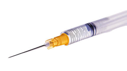 Close-up shot of a transparent syringe filled with a red liquid, medical healthcare concept. It symbolizes medical treatment and vaccination. Isolated Transparent Background, PNG