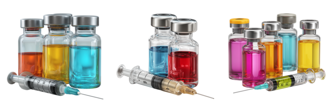 Set of Medical injection equipment, ampoules and syringe on transparent png background. Ai generated