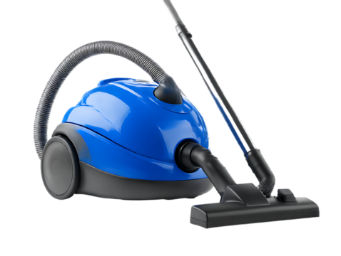 Modern blue canister vacuum cleaner with hose and floor nozzle isolated on transparent background