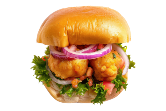 Crispy chicken sandwich Vada pav with red onions, herbs, and soft bun isolated on white background, concept of fast food