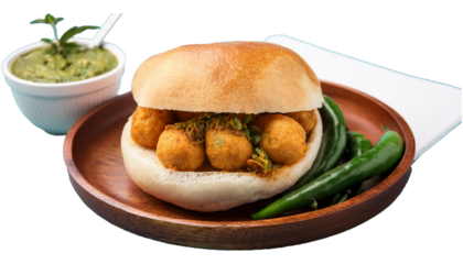 Indian vada pav with green chilies on rustic wooden plate - culinary delight for food photography - transparent background png