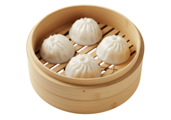 蒸し器に入った四つの白い点心のクローズアップ 透明な背景に置かれた茶色の竹製の蒸し器