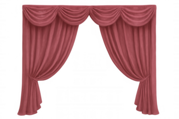 Red curtains with a sophisticated swag valance elegantly frame a transparent background, creating a dramatic and versatile backdrop