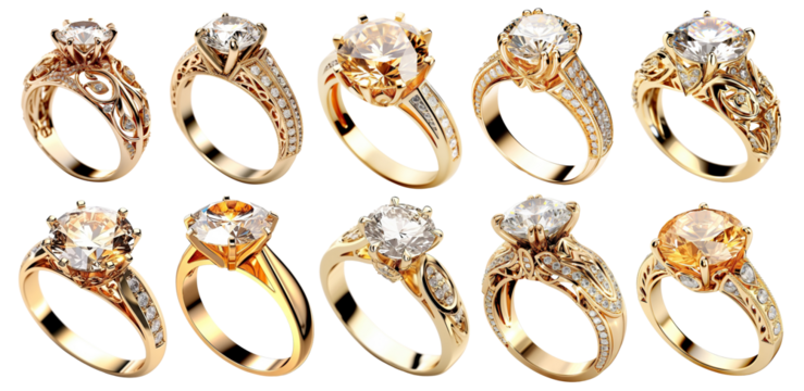 Set of beautiful gold engagement rings with diamonds, cut out