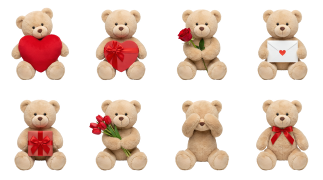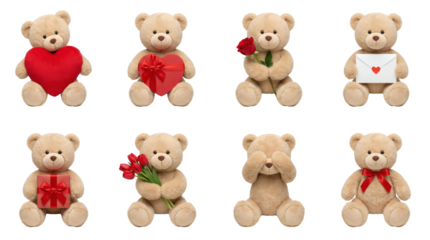 Teddy bear set including plush toys with heart, rose, gift box, tulips, envelope, and bow isolated. Valentines day and romantic gift collection.