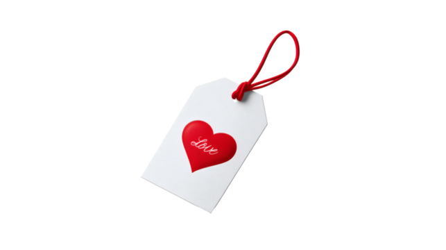 Valentine’s Day shopping tag with heart icon, retail branding element, isolated on a white background