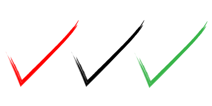 Set of three hand-drawn brush stroke checkmarks in red, black, and green colors with grunge texture, Isolated on transparent Background
