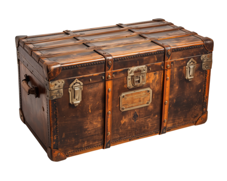 Isolated antique steamer trunk, vintage luggage for travel, rustic storage container for home