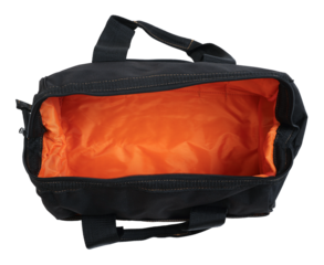 Isolated brown striped luggage for travel, vacation, and transporting personal belongings