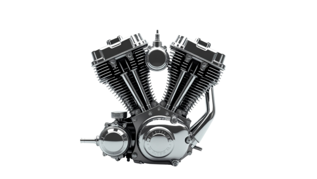 Highly polished chrome v twin motorcycle engine on a stark showcasing powerful mechanical engineering detail