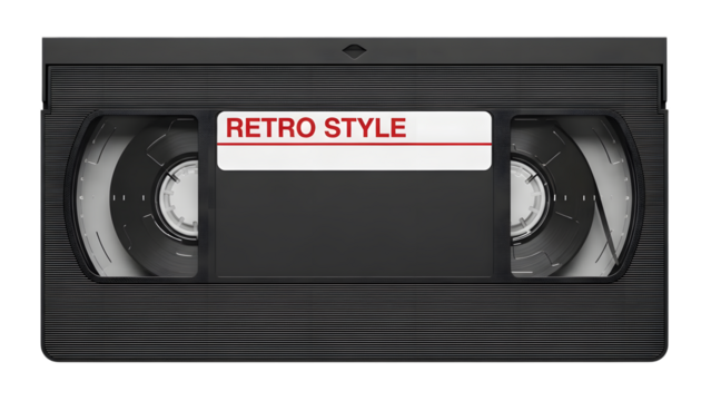 V H S cassette tape with retro style label on front showing two visible tape reels isolated on a transparent background