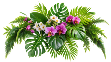 Tropical ivy plant bush floral arrangement with rainforest leaves Monstera and fern and Vanda orchids tropical flower decor on tree branch liana vine plant isolated on white background. cut-out