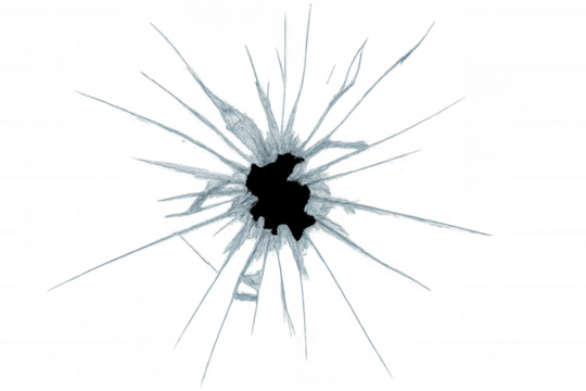Broken glass pane with spider web cracks spreading from a central impact hole, transparent background