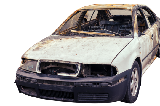Burnt-out rusty cars on a city street, vandalism. Setting fire to cars by vandals and damage to property, isolated on a white background