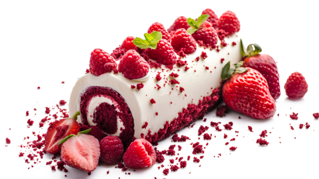 Red velvet rolled cake with fresh strawberries and cream cheese isolated on a white background, Valentine's Day Concept