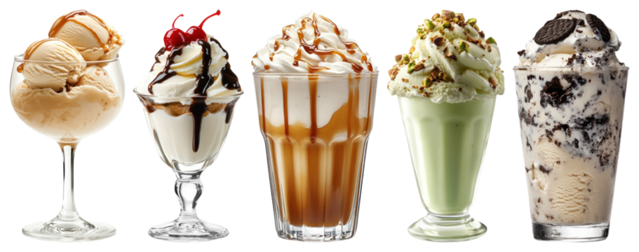 A delightful display of four creamy milkshakes in tall glasses. flavors of chocolate. vanilla. and strawberry. garnished with whipped cream and chocolate shavings. set against a clean white background
