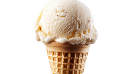 Delicious vanilla ice cream cone isolated on transparent background, close up shot