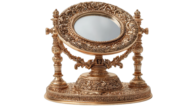 Elegant gold vanity mirror isolated, oval shape with marble base for makeup and grooming on a clean backdrop