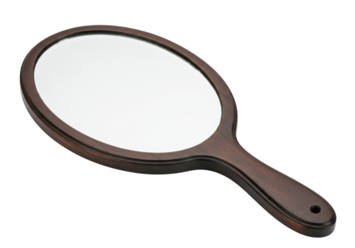 Isolated hand mirror in a brown wooden frame for makeup and cosmetic touch ups on the go