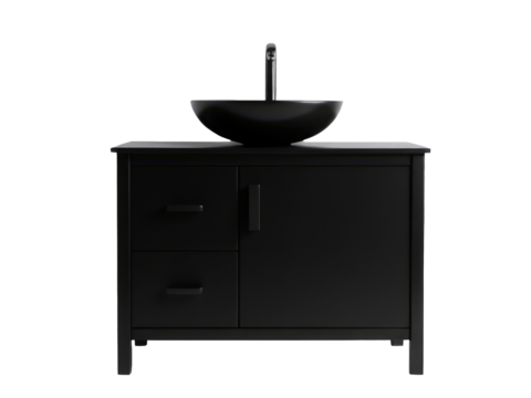 Modern bathroom fixture featuring a black vanity and bowl sink