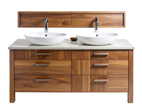 Modern Wooden Double Vanity with Twin Sinks and Minimalist Drawers, Front View, Isolated PNG