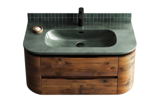 Modern bathroom vanity featuring a green stone countertop and rustic wood cabinet design style on transparent background