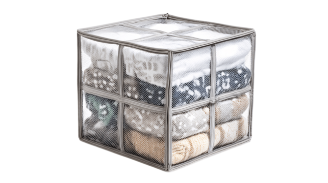 A foldable mesh storage cube with zipper top variant 6661, white background --ar 16:9