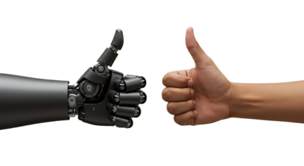 Photorealistic variant: matte black robot hand, medium-tan human hand, perfect mirrored thumbs up. Isolated on transparent background, png