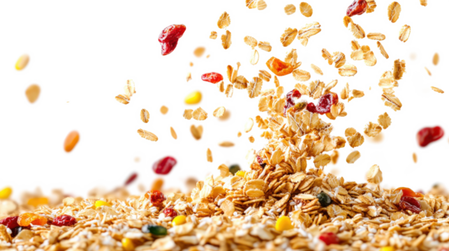 A bowl of cereal with a lot of different colored pieces of fruit and nuts