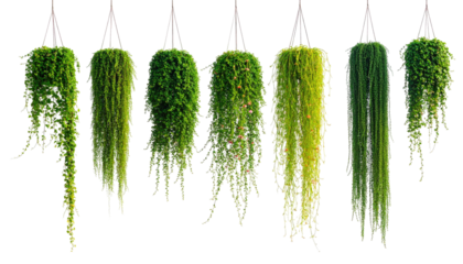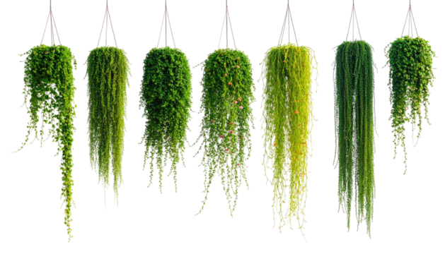 Seven hanging plants with varied foliage, suspended from thin wires, on a black background