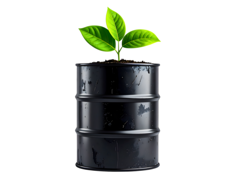 A black oil barrel with a small plant growing out of it, symbolizing the contrast between oil and sustainability. full length isolate on transparent background