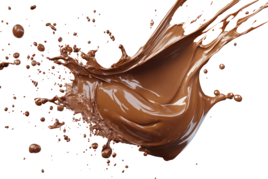 A rich, creamy chocolate splash twisting in the air, showing detailed textures and varying thicknesses of the liquid as it splatters outward.