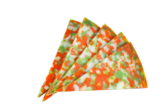 Slices of piquant spicy multicolored cheese isolated on white background.Top view