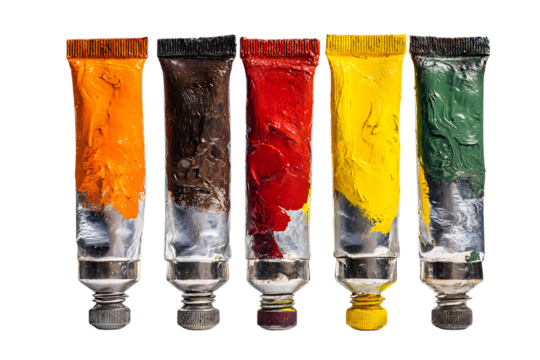 Five tubes of paint in vibrant colors.
