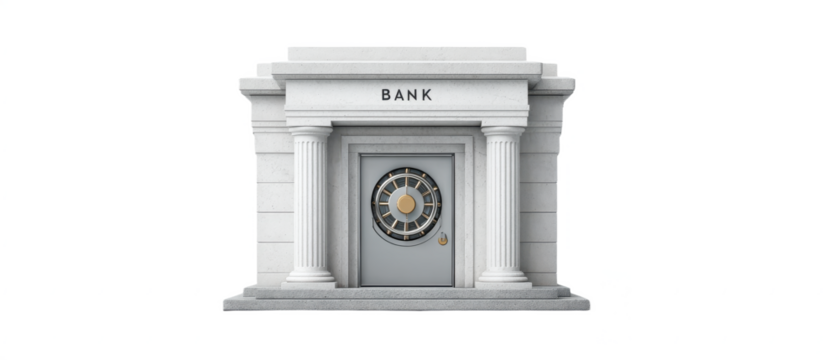 A classical bank building facade with large pillars and a secure vault door in the center.