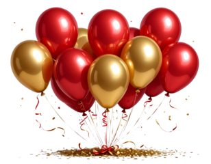 Four red balloons with ribbons on transparent background celebratory graphic