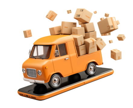3d cartoon-style icon of an orange delivery van inside a mobile phone, with boxes flying out from it, on a white background, transparent png.