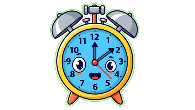 Adorable cartoon alarm clock sticker with a smiling face and pink accents