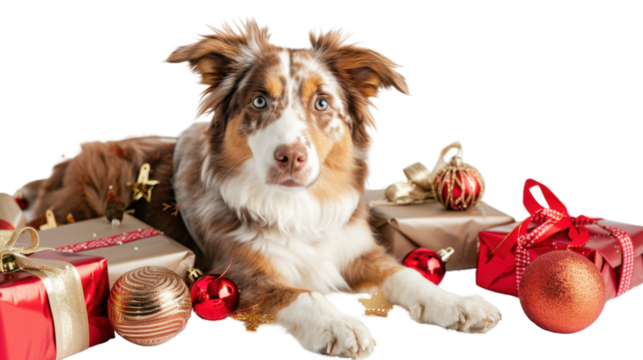 Different types of fluffy dogs sit in a row, a transparent background is isolated. Header banner mockup with copy space. AI generated.