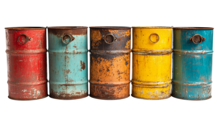 Colorful metal oil barrels isolated transparent background