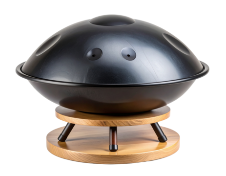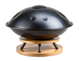 Minimalist Black Handpan Drum on Wooden Stand, Front Angle, Isolated on Transparent Background