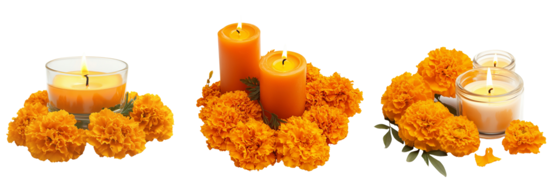 Set of A bright and cheerful vector of marigold flowers forming a circular wreath with a candle in the center on transparent png background