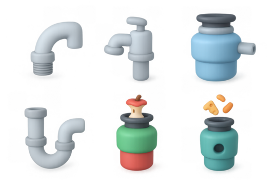 Cartoon plumbing icons for design projects featuring pipes and faucets