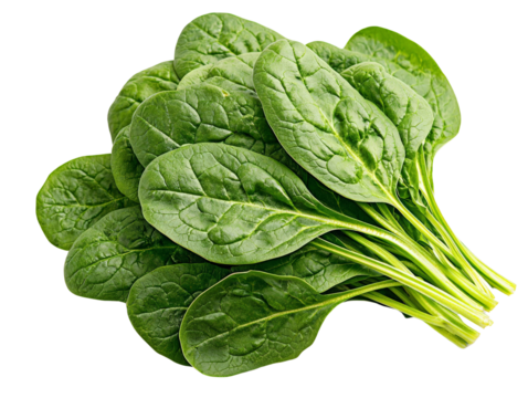 A bunch of fresh green spinach leaves with detailed veins, isolated on a transparent background, PNG file.