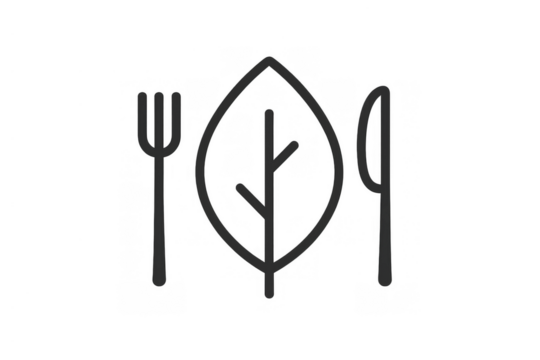 Vegan and healthy eating icon with cutlery and leaf graphic element, showing plant-based diet concept with transparent background