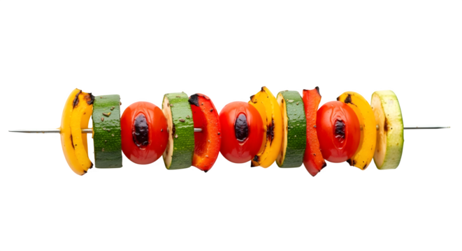 Grilled vegetable skewer with zucchini, tomato, bell pepper, and banana pepper isolated on transparent background, a delicious and healthy summer meal