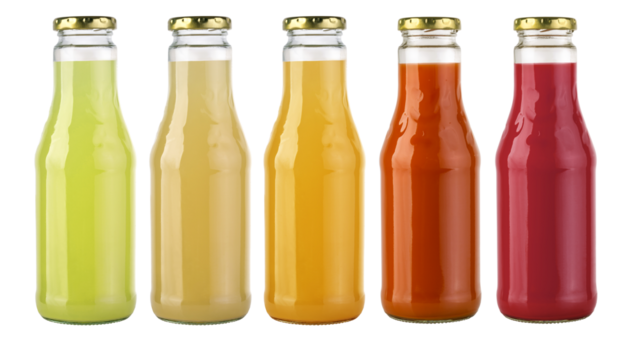Vegetable and fruit juice bottles transparent background high quality details - 3D rendering