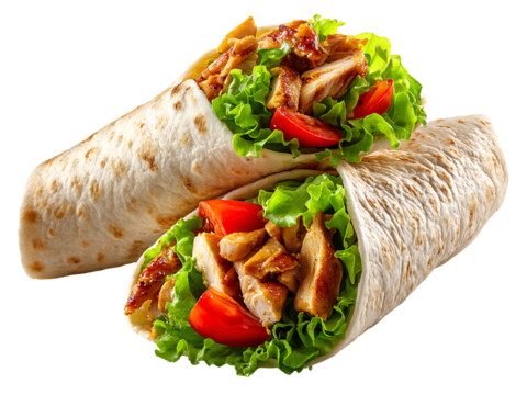 Two chicken shawarma wraps with lettuce and tomato, transparent background